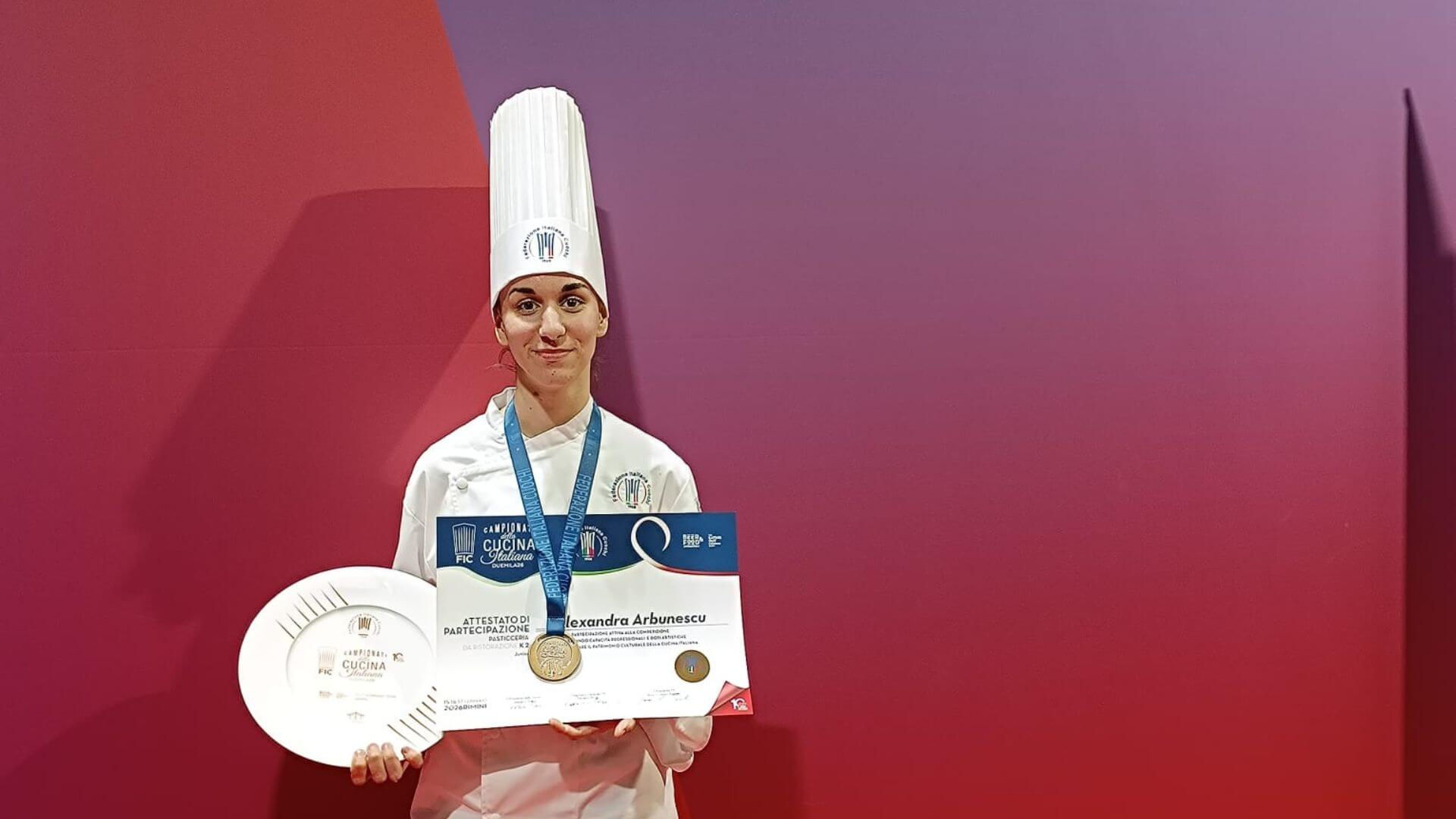 Martedì 17 Febbraio, nell’ambito di Beer & Food Attraction a Rimini, si sono svolti i Campionati della Cucina Italiana 2026. Tra i giovani talenti delle scuole alberghiere, Alexandra Arbunescu, studentessa di terza della Scuola Professionale DIEFFE di Noventa Padovana, ha conquistato il Bronzo nella categoria Juniores Pasticceria da Ristorazione (K2).